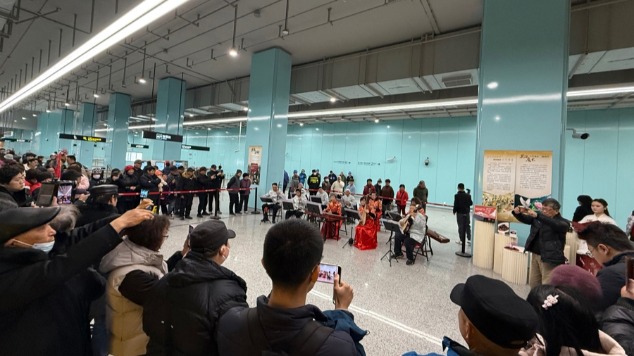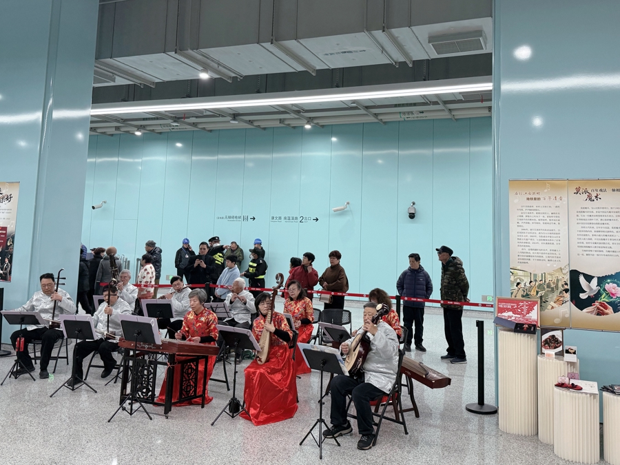 现场,庙行丝竹演出团队带着精心编排的经典曲目亮相,悠扬婉转的丝竹声在站内回荡。团队成员不仅现场演奏,还邀请市民加入互动,在乐师指导下尝试拨动古筝琴弦。尽管手法生疏,却赢得周围观众掌声连连。乐队成员还同步介绍庙行丝竹的发展历史,市民们围聚聆听,有人轻声跟唱,有人闭目陶醉,感受传统韵律的魅力。